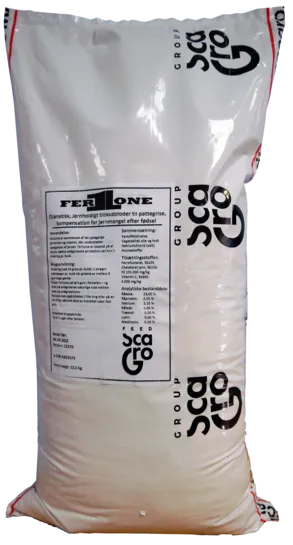 Fer1one er et diætisk jernholdigt tilskudsfoder, der tildeles 1 gang pr. kuld.