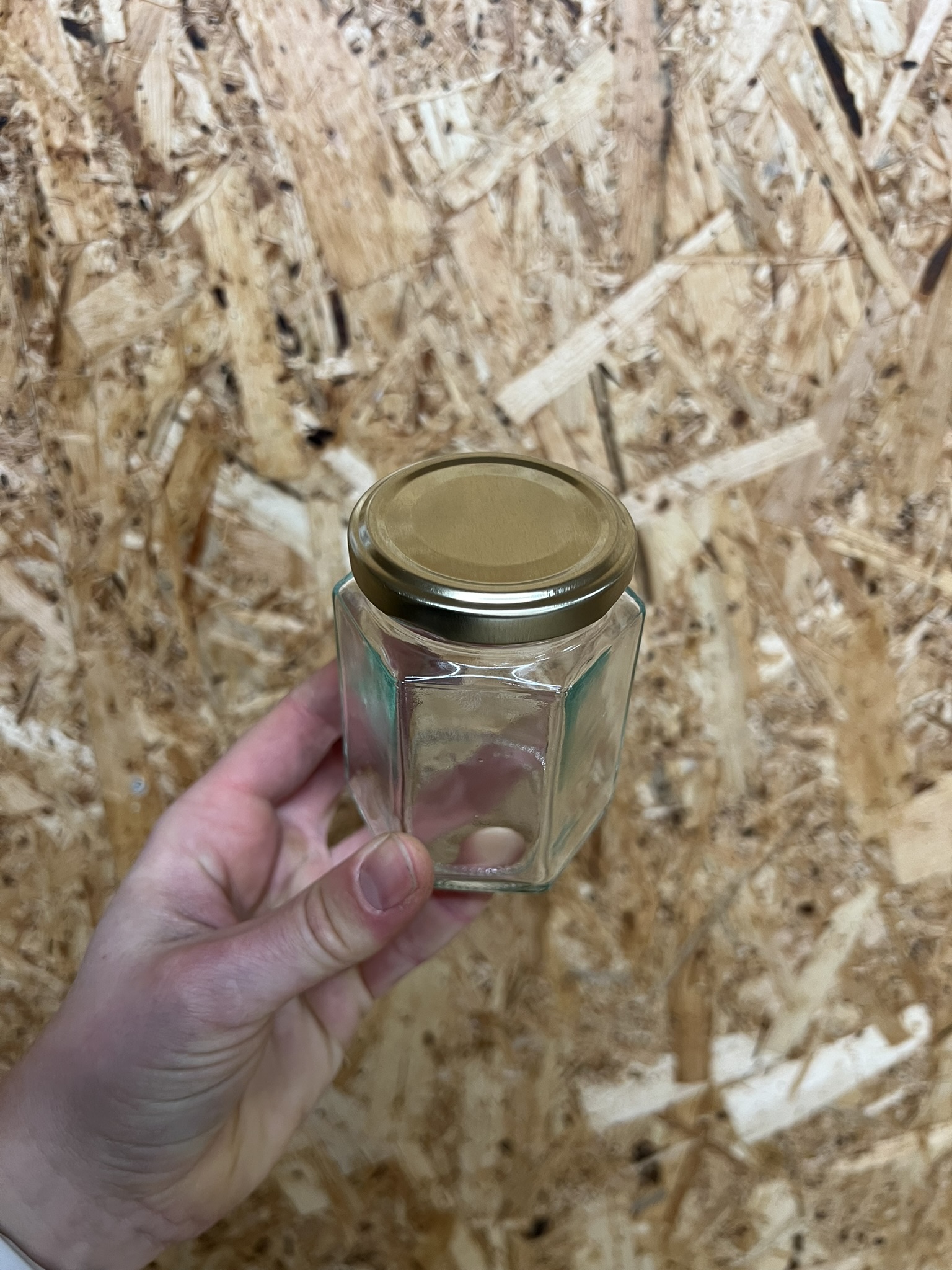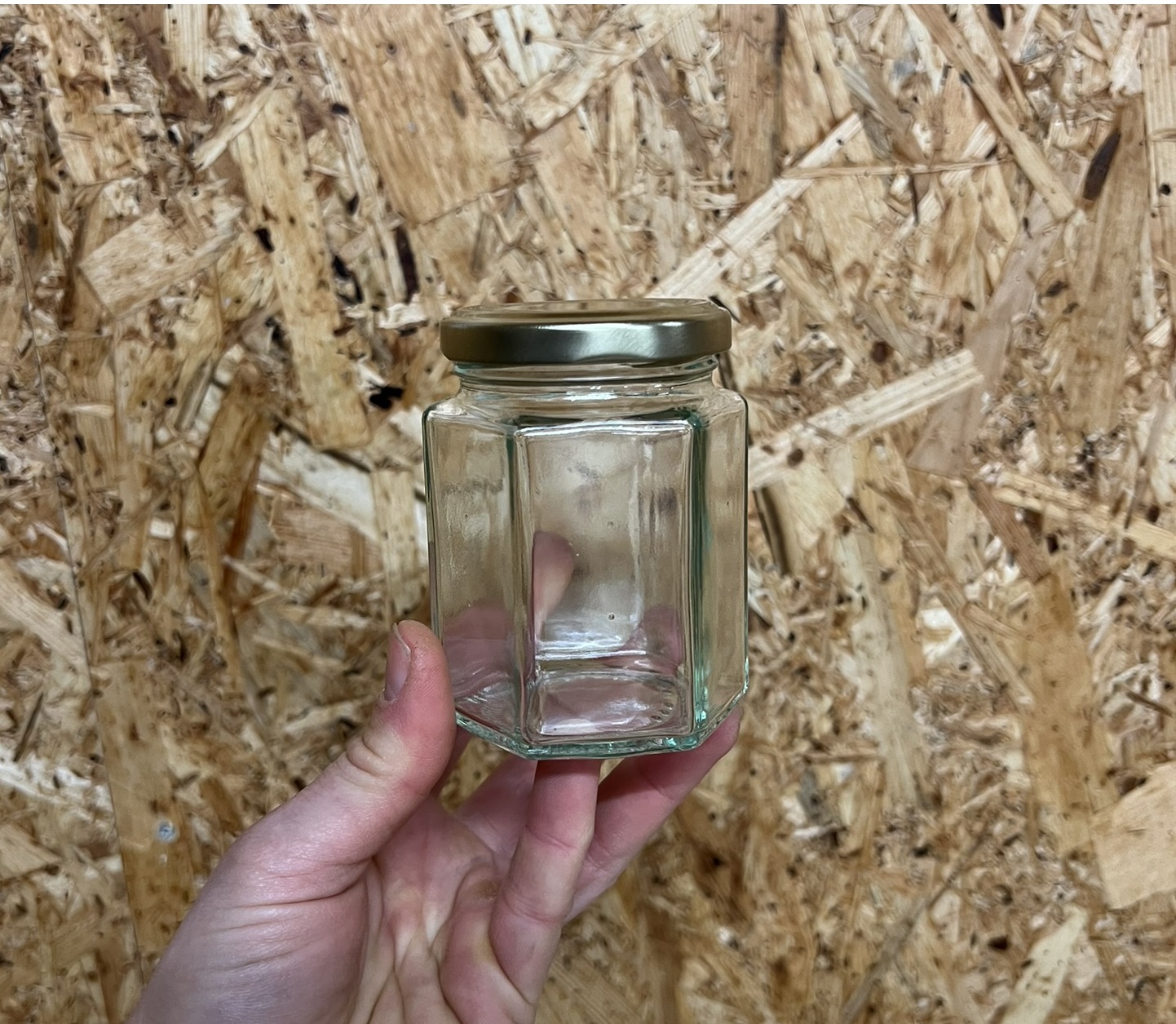 6-kantede honning-glas, 250 gram. Tilhørende metal låg.