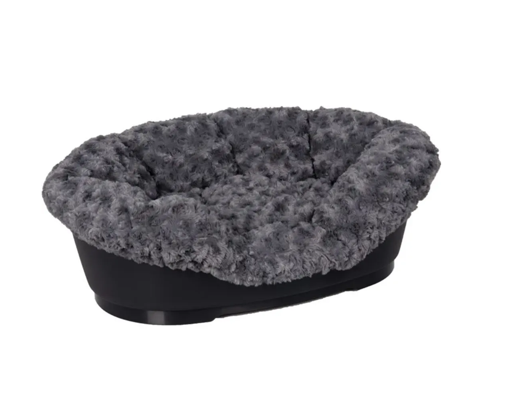 Lækkert blødt betræk til hundekurv af plast med elastik rundt i kanten for at holde betrækket på plads.