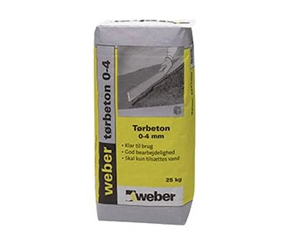 Weber tørbeton 0-4 mm er en 1-komponent tørbeton, der alene skal tilsættes vand. Produktet indeholder portlandcement, 0-4 mm sand og plastificerende additiv.