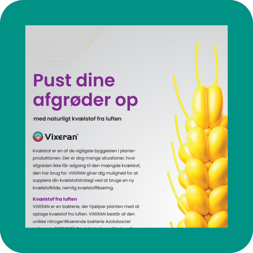 Planter klarer sig ikke uden kvælstof. VIXERAN er en bakterie, der kan sprøjtes ud på afgrøderne, der øger deres naturlige optag af kvælstof fra luften. Det er en bæredygtig og skånsom måde at øge kvælstof i afgrøderne, og må benyttes i både konventionelle og økologiske landbrug.
